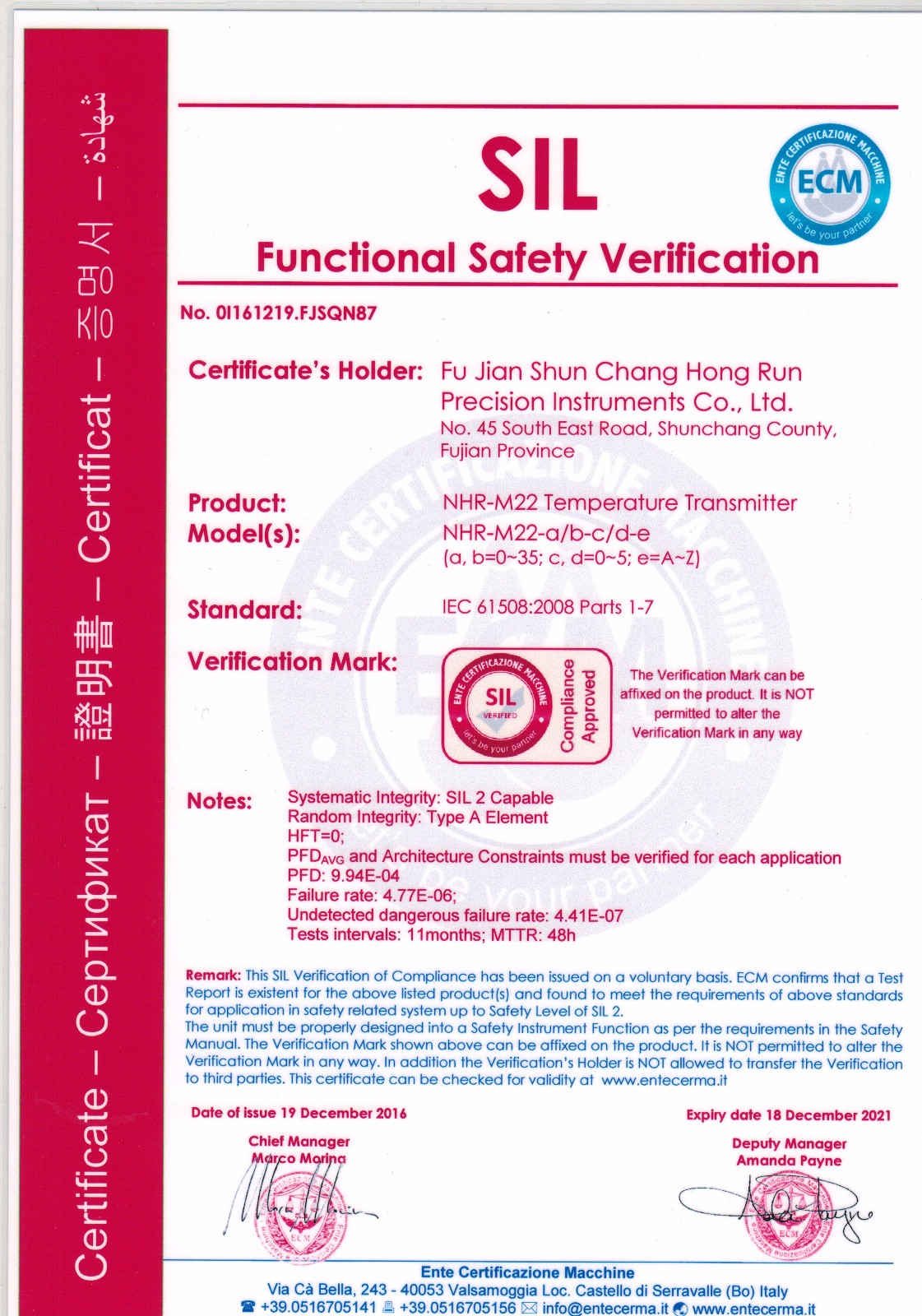 虹潤智能儀表產品獲得國際SIL功能安全認證
