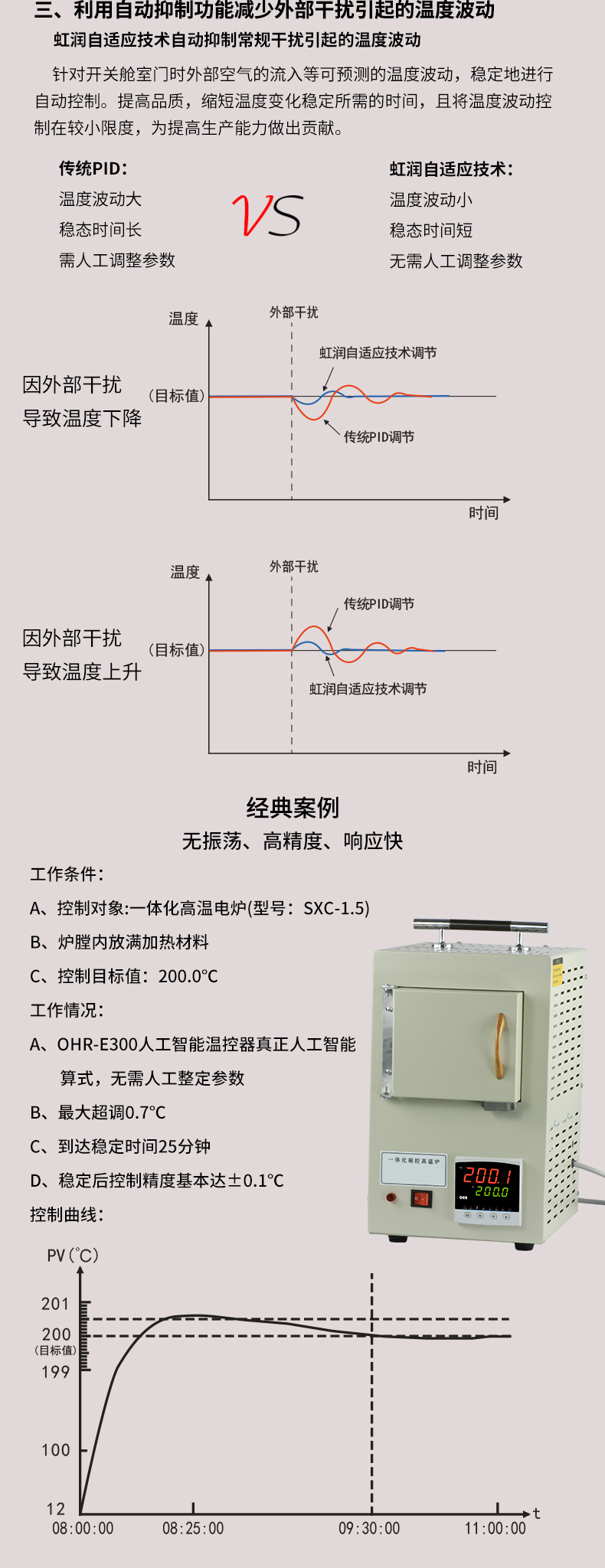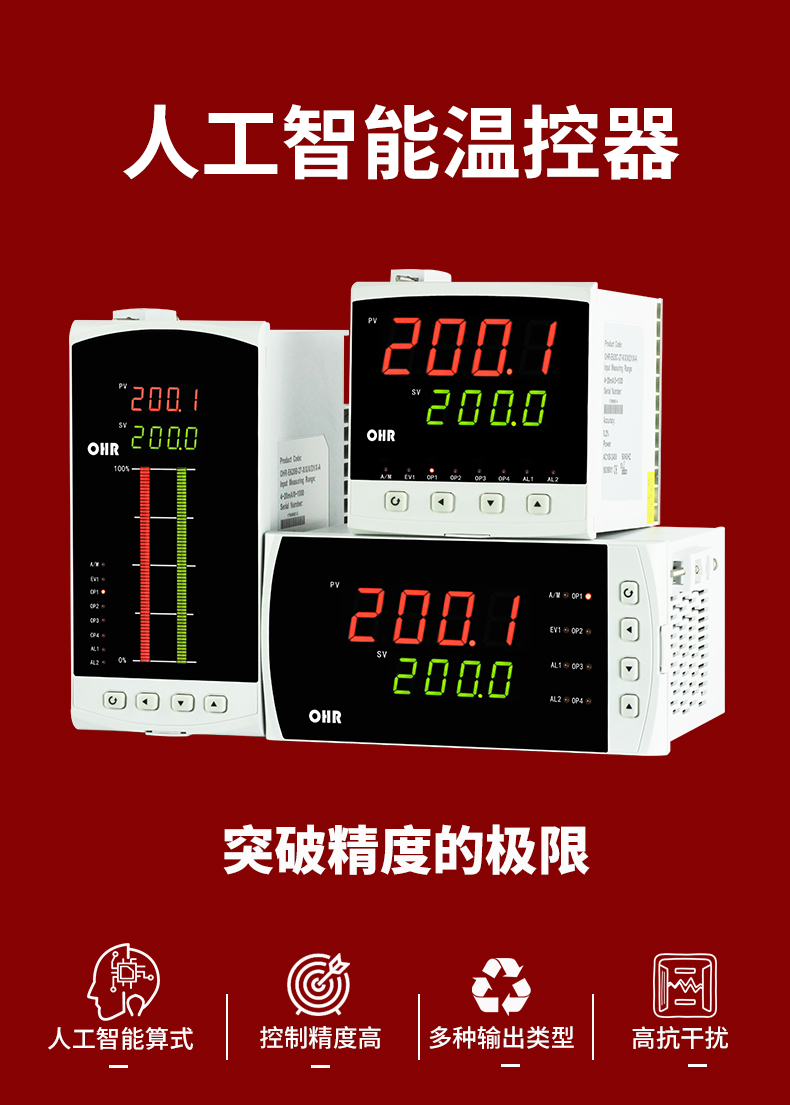 OHR-E300系列人工智能調節儀采用真正的人工智能算式,儀表啟動自整定功能,可以根據被控對象的特性,自動尋找參數以達到很好的控制效果,無需人工整定參數。控溫精度基本達±0.1℃,無超調、欠調,達國際先進水平。