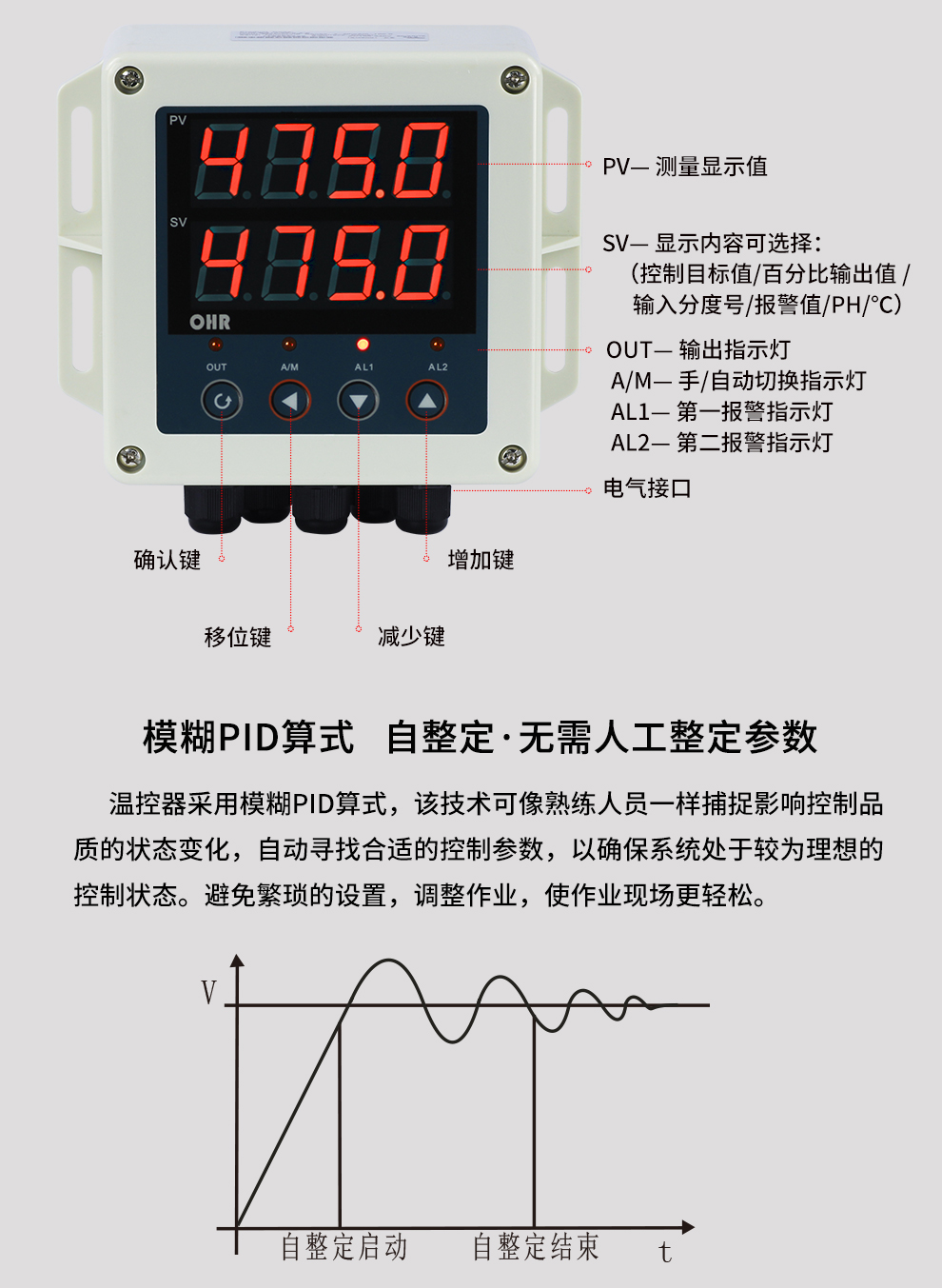 OHR-BG30/BG40系列壁掛式智能溫控器/60段程序溫控器采用了表面貼裝工藝,全自動貼片機生產(chǎn),具有很強的抗干擾能力。本儀表采用人工智能算式,儀表啟動自整定功能,可以根據(jù)被控對象的特性,自動尋找參數(shù)以達到很好的控制效果,無需人工整定參數(shù),控溫精度基本達±0.2℃,無超調(diào)、欠調(diào),性價比高。