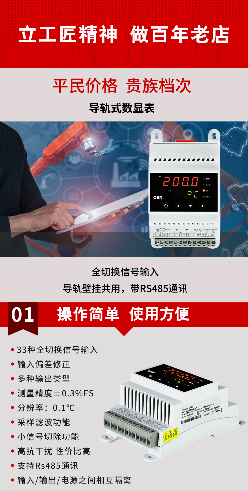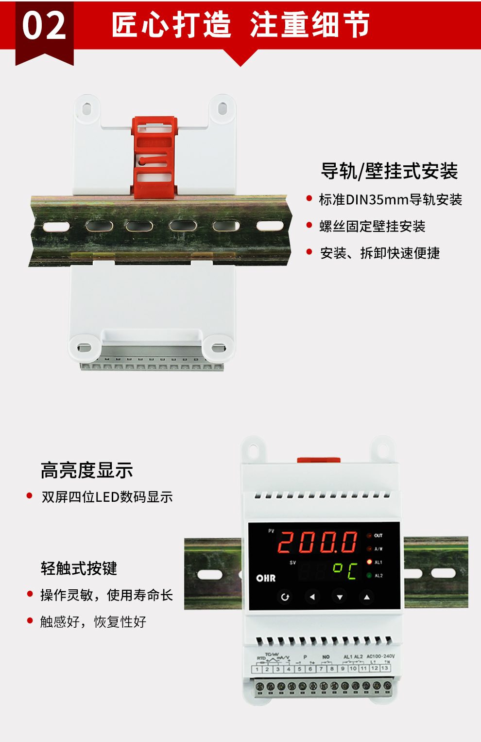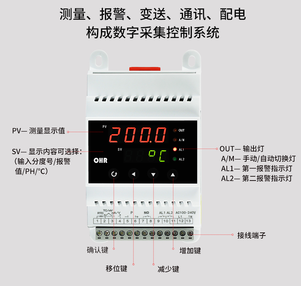 OHR-DN10系列導軌式數字顯示控制儀采用了表面貼裝工藝,全自動貼片機生產,具有很強的抗干擾能力。可對溫度、壓力、液位等工業過程參數進行測量、顯示、報警控制、變送輸出、數據采集及通訊。