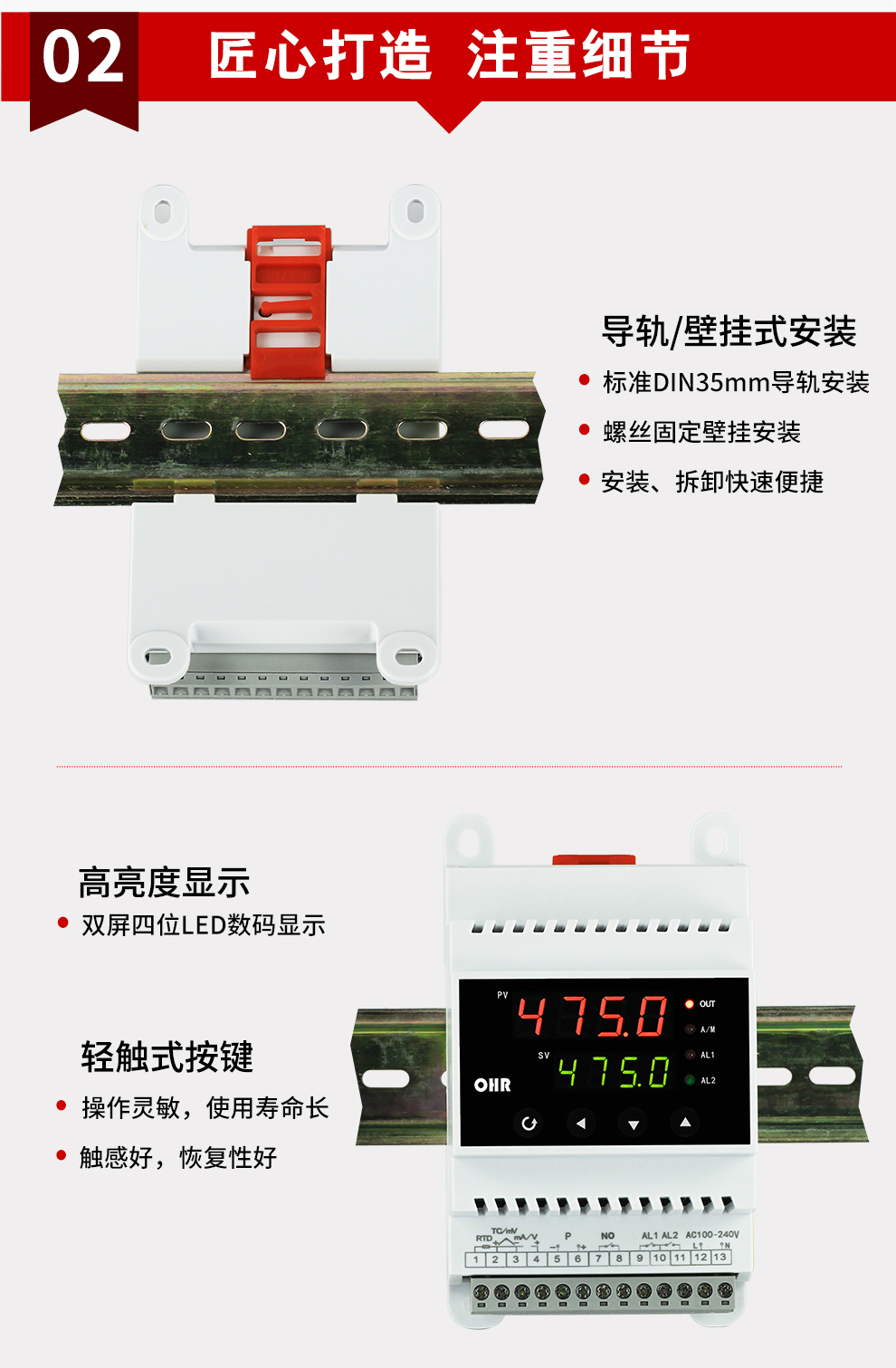 OHR-DN30/DN40系列導軌式智能溫控器/60段程序溫控器采用了表面貼裝工藝,全自動貼片機生產,具有很強的抗干擾能力。本儀表采用人工智能算式,儀表啟動自整定功能,可以根據被控對象的特性,自動尋找參數以達到很好的控制效果,無需人工整定參數,控溫精度基本達±0.2℃,無超調、欠調,性價比高。