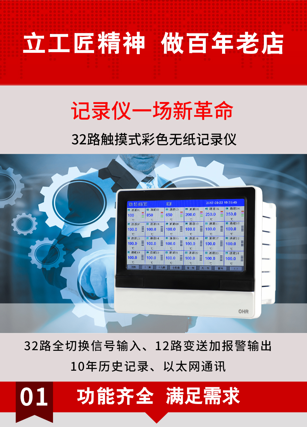 OHR-H700C系列觸摸式彩色無紙記錄儀用新型大規(guī)模集成電路,對輸入、輸出、電源、信號采取可靠保護和強抗干擾設計。32路萬能輸入,可帶12路報警或12路變送輸出,RS232/485通訊接口,以太網(wǎng)接口,微型打印機和USB接口,SD卡插座;可提供傳感器配電;具有強大的顯示功能,實時曲線顯示,歷史曲線追憶等。