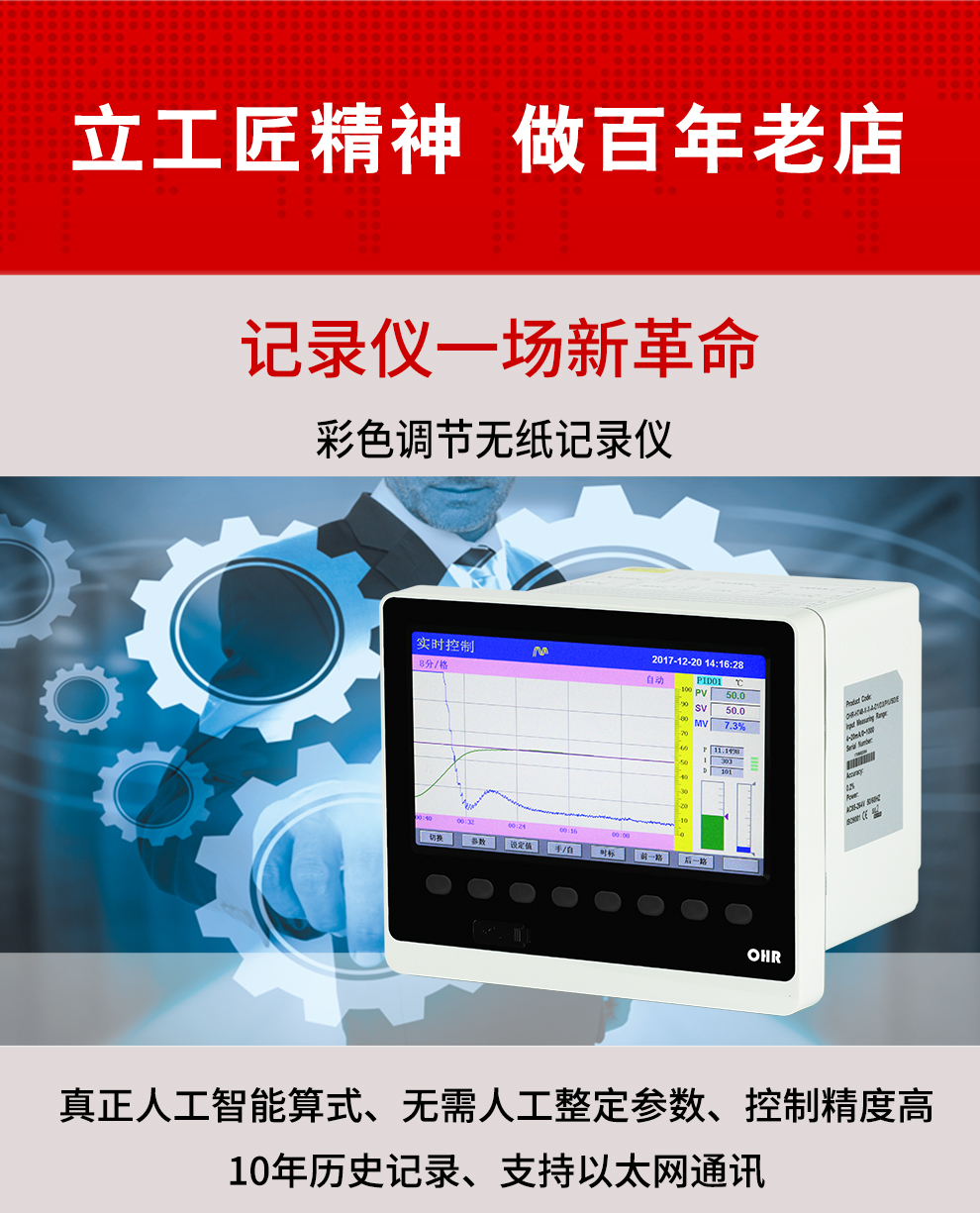 OHR-H300系列彩色調節無紙記錄儀采用真正的人工智能算式,儀表啟動自整定功能,可根據被控對象的特性,自動尋找最優參數以達到很好的控制效果,無需人工整定參數。控溫精度基本達±0.1℃,無超調、欠調,達國際先進水平。24路萬能輸入(可組態選擇輸入:標準電壓、標準電流、熱電偶、熱電阻、毫伏等)其中可帶8路控制輸入。