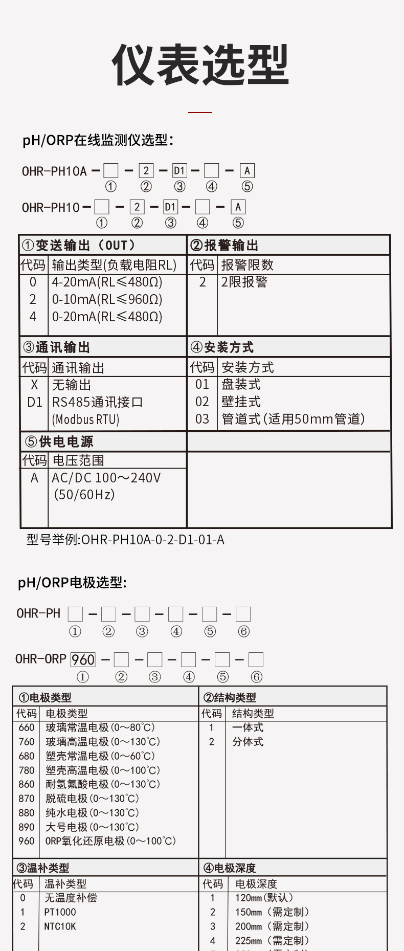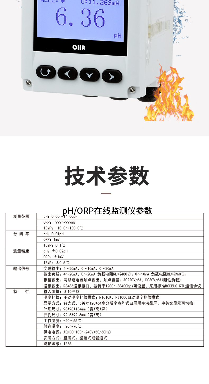 OHR-PH10A系列pH/ORP在線監測儀是一款智能在線化學分析儀器(酸度計、pH計、pH酸度計、酸度計phs-25),具備一路RS485通訊輸出、一路模擬信號輸出和兩路繼電器報警輸出。廣 泛應用于環保水處理、純凈水、循環水、鍋爐水等系統以及電子、電鍍、印染、化學、食品、制藥等制程 領域。