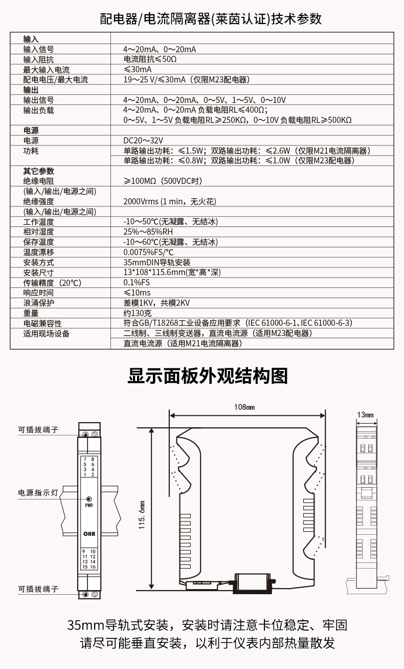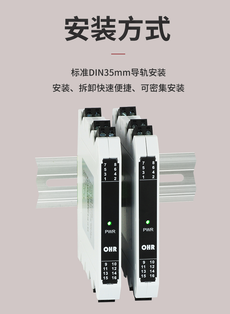 OHR-M23系列配電器給二、三線制變送器提供隔離的電源電壓,將變送器產(chǎn)生的直流電流信號(hào)經(jīng)過(guò)隔離傳送,轉(zhuǎn)換成所需的信號(hào)給其它儀表??梢耘c單元組合儀表及DCS、PLC等系統(tǒng)配套使用,給予現(xiàn)場(chǎng)儀表信號(hào)隔離、信號(hào)轉(zhuǎn)換、信號(hào)分配、信號(hào)處理等,從而提高工業(yè)生產(chǎn)過(guò)程自動(dòng)控制系統(tǒng)的抗干擾能力,保證系統(tǒng)的穩(wěn)定性和可靠性。