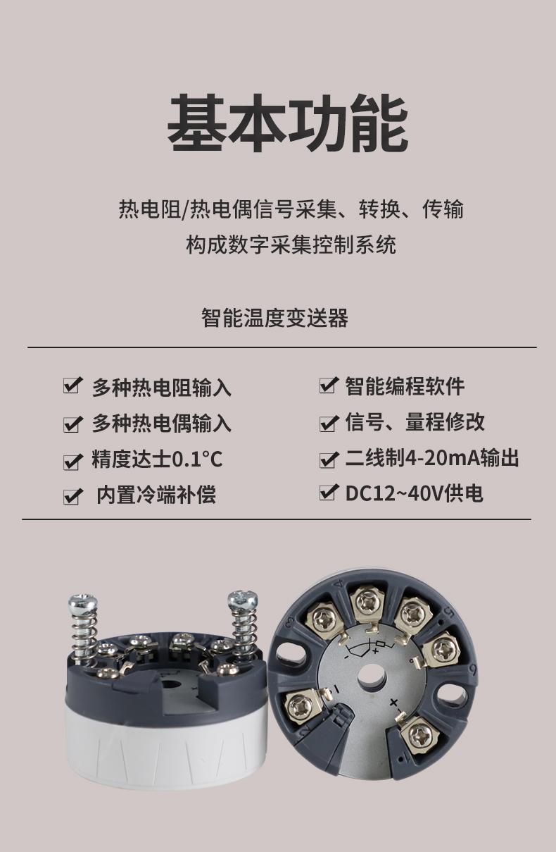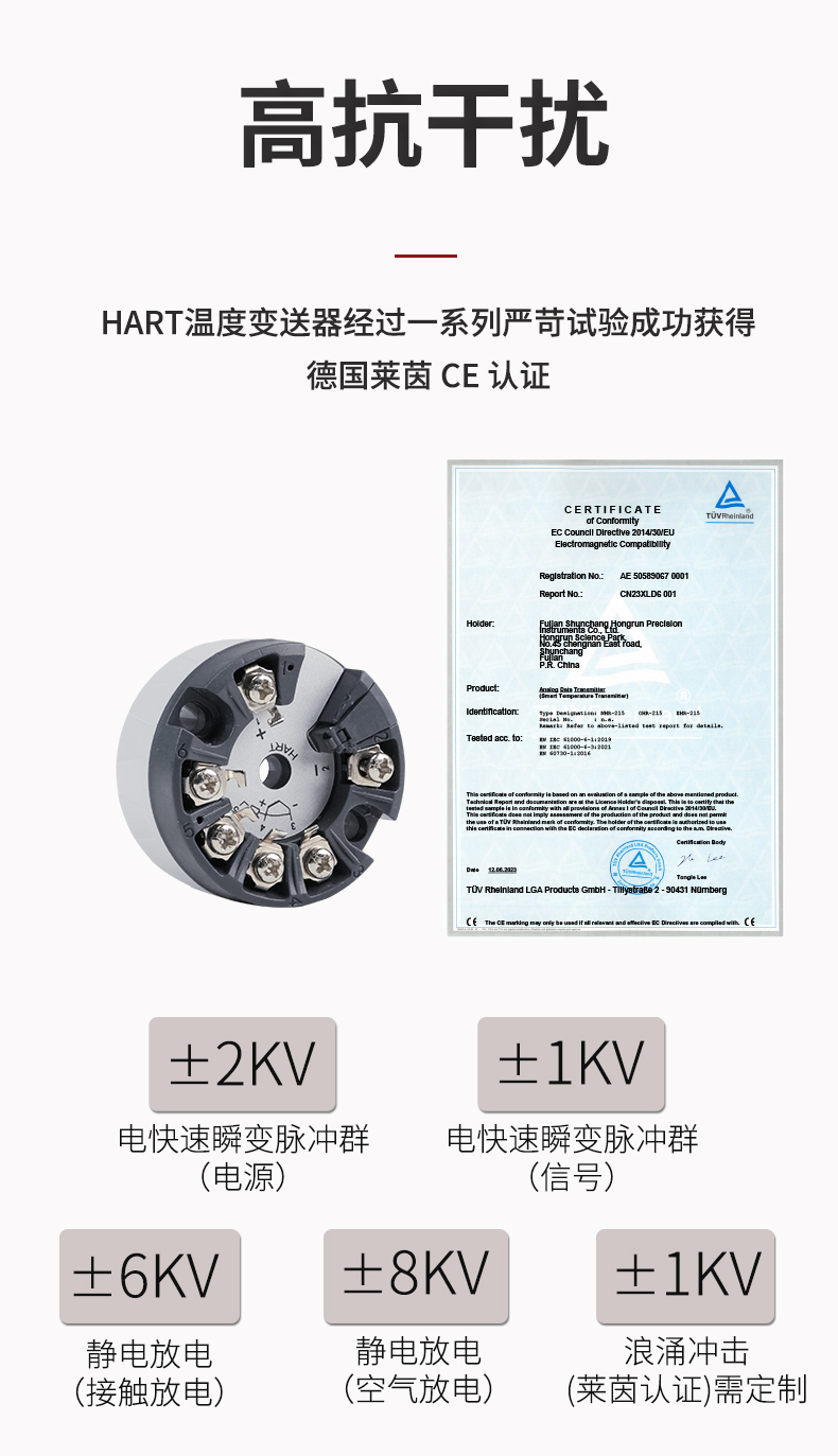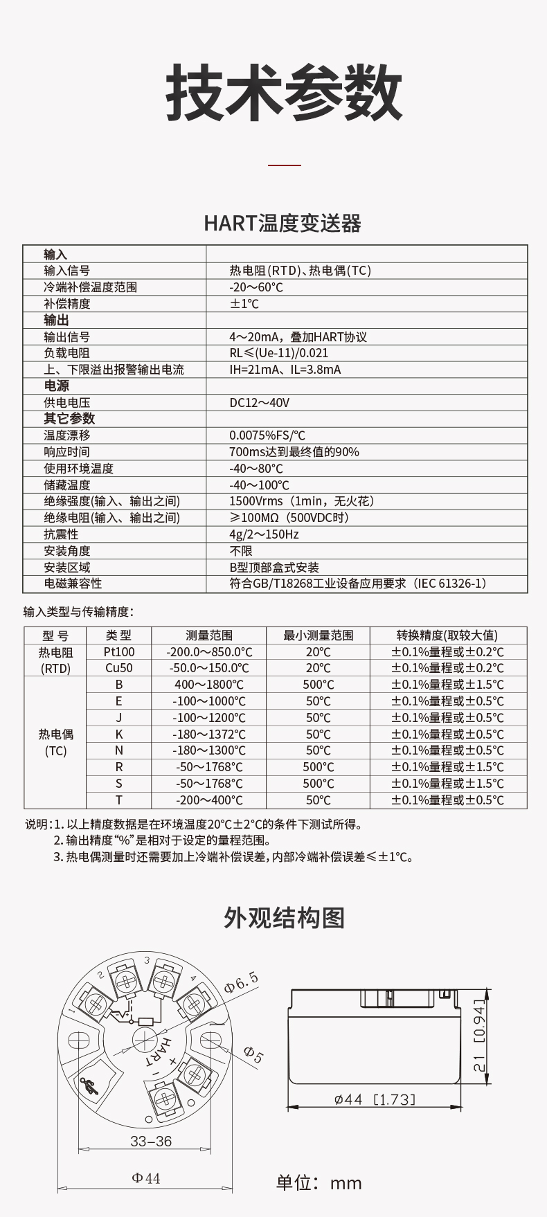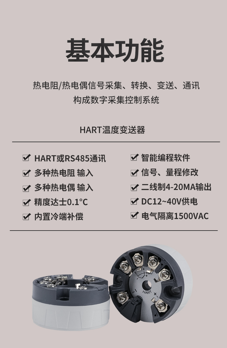 HART智能溫度變送器(圓卡),用于熱電阻(RTD)、熱電偶(TC)信號輸入,二線制4~20mA模擬輸出,通過HART協議組態,安裝于傳感器內部(Form B)。