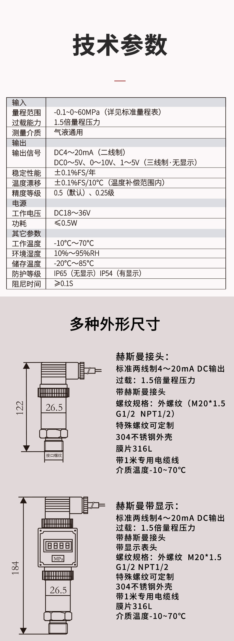 M系列小巧型壓力變送器內部使用擴散硅壓阻式傳感器,其結構簡單,體積小巧,易安裝;以其優良的可靠性、適用性、靈活性和多樣性,廣泛的應用于航空、航天、石油、化工、冶金、電力、水利等工業過程現場的壓力測量和控制。