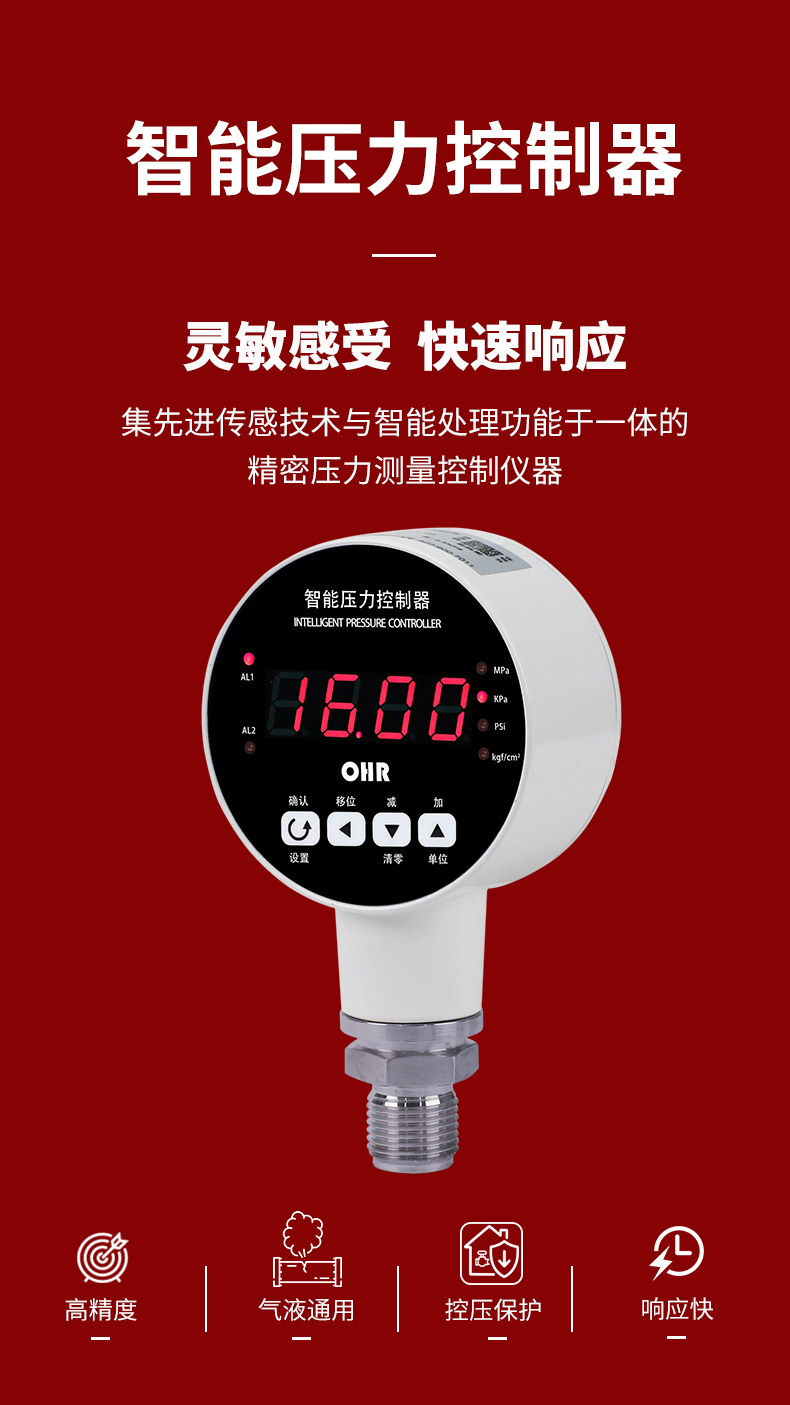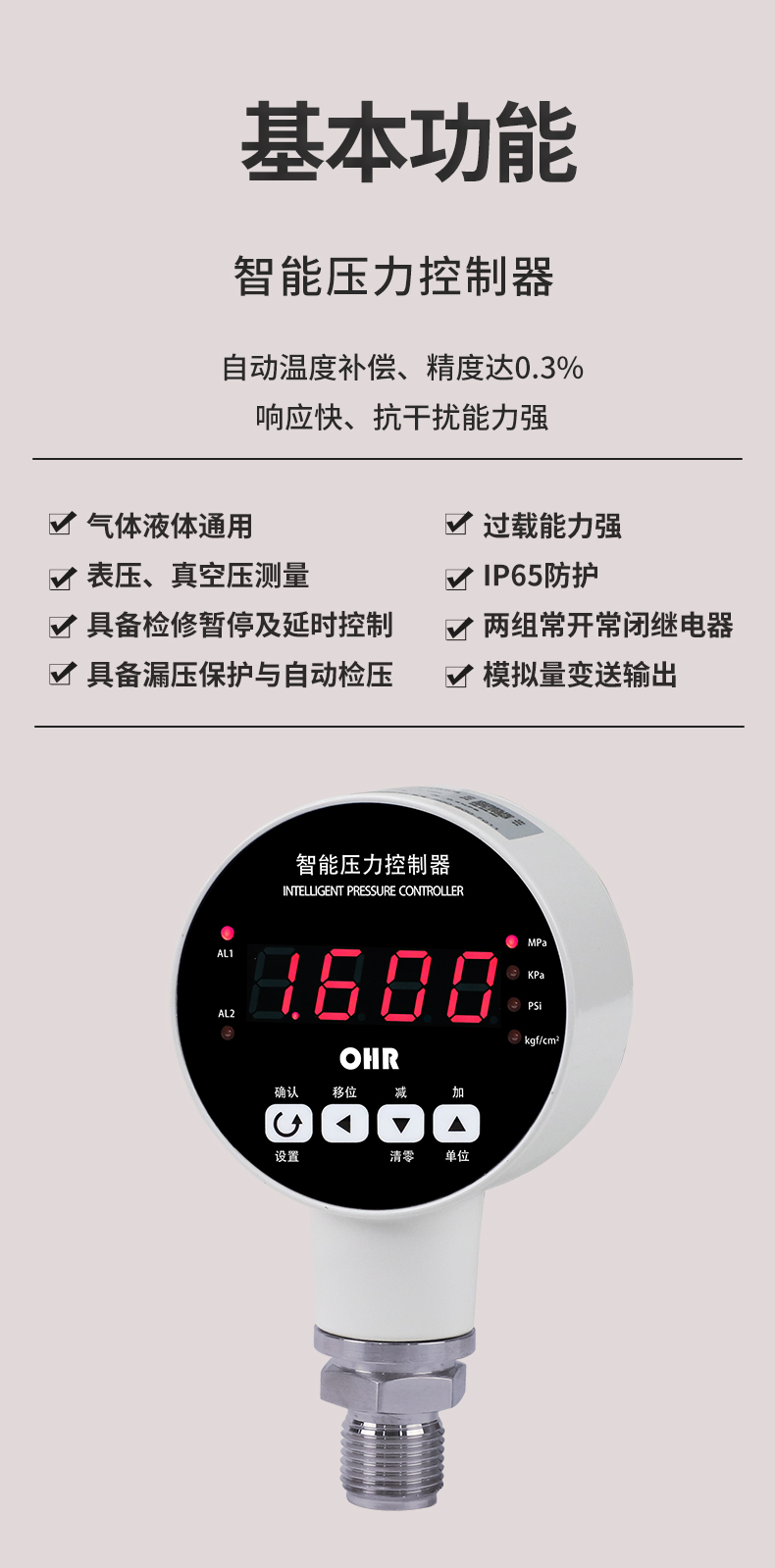 OHR-DP20系列智能壓力控制器是集壓力測量,顯示,輸出,控制于一體的智能數顯壓力測控產品。廣泛應用于水電 ,自來水,石油,化工,機械,液壓等行業,對流體介質的壓力進行現場測量顯示和控制。