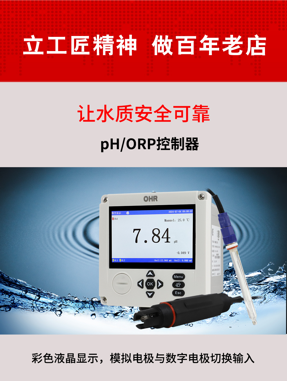 OHR-PH70系列pH/ORP控制器是一款在線化學分析控制器,主要用于測量水溶液的pH值 和ORP值。用戶可以通過配接相應的pH電極或ORP電極來進行測量。該控制器能夠實時監 測溶液的酸堿度情況,為相關工業過程提供準確的化學分析數據。