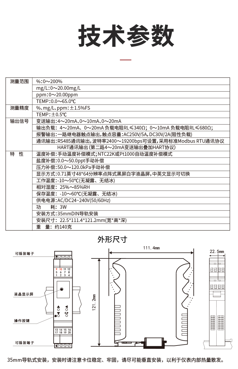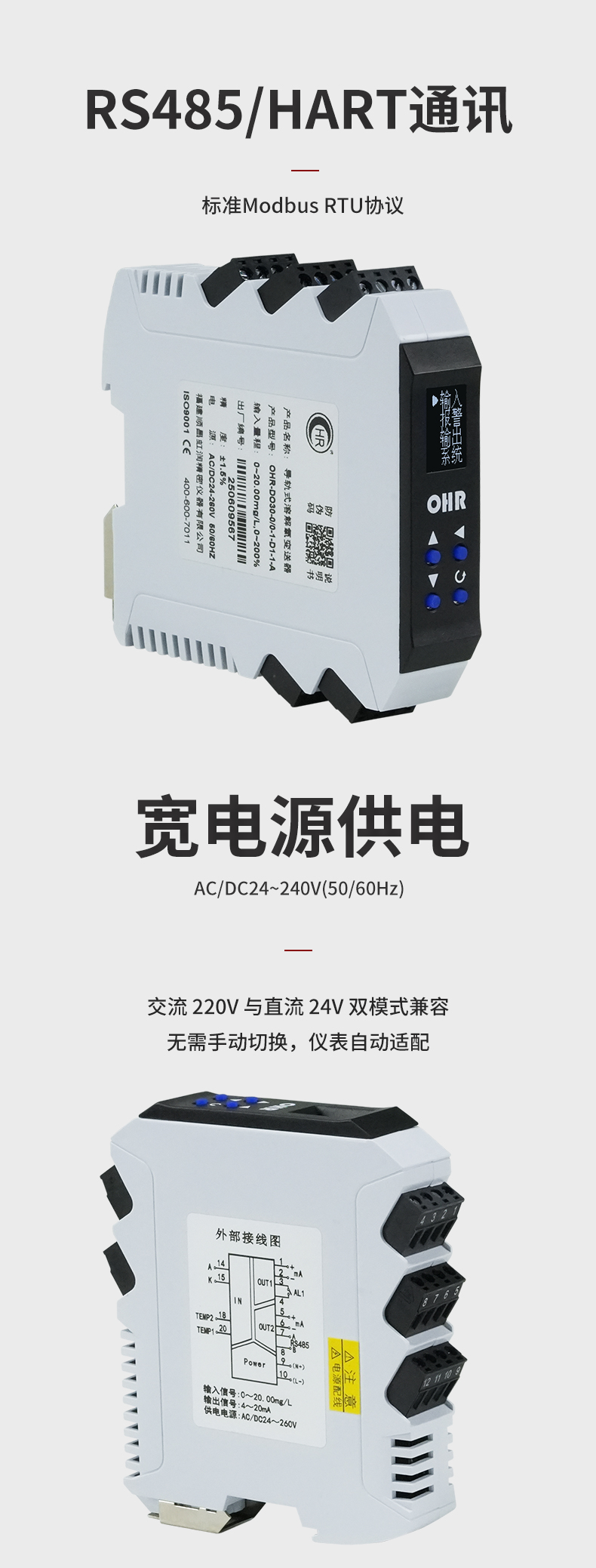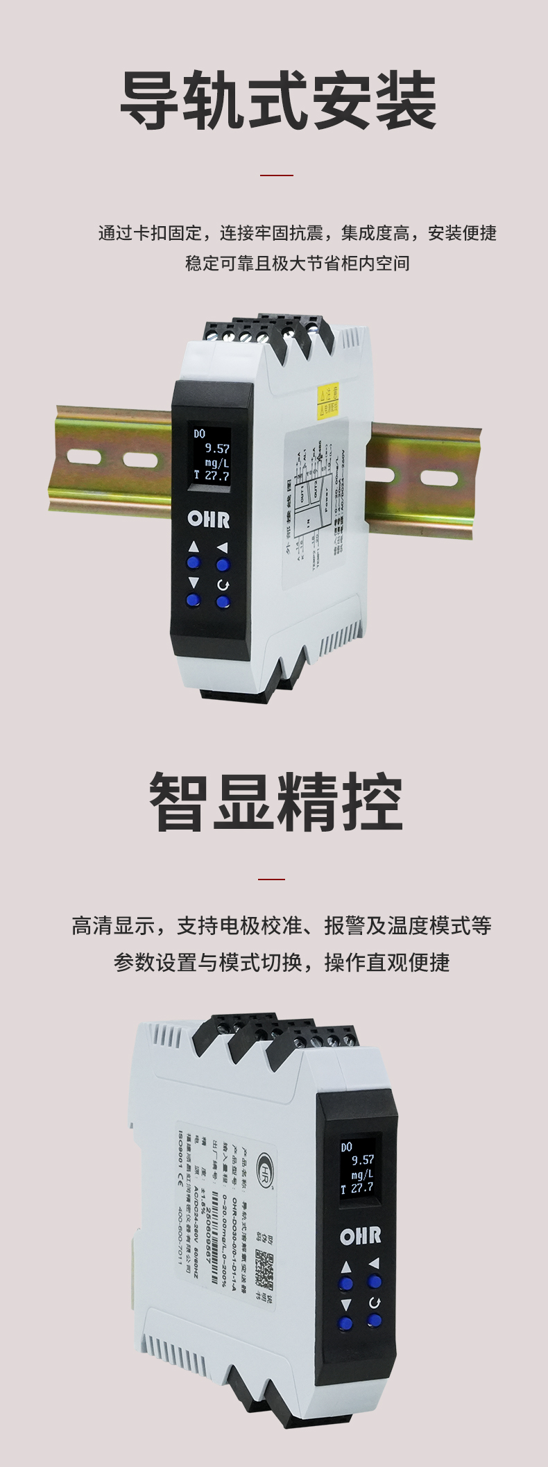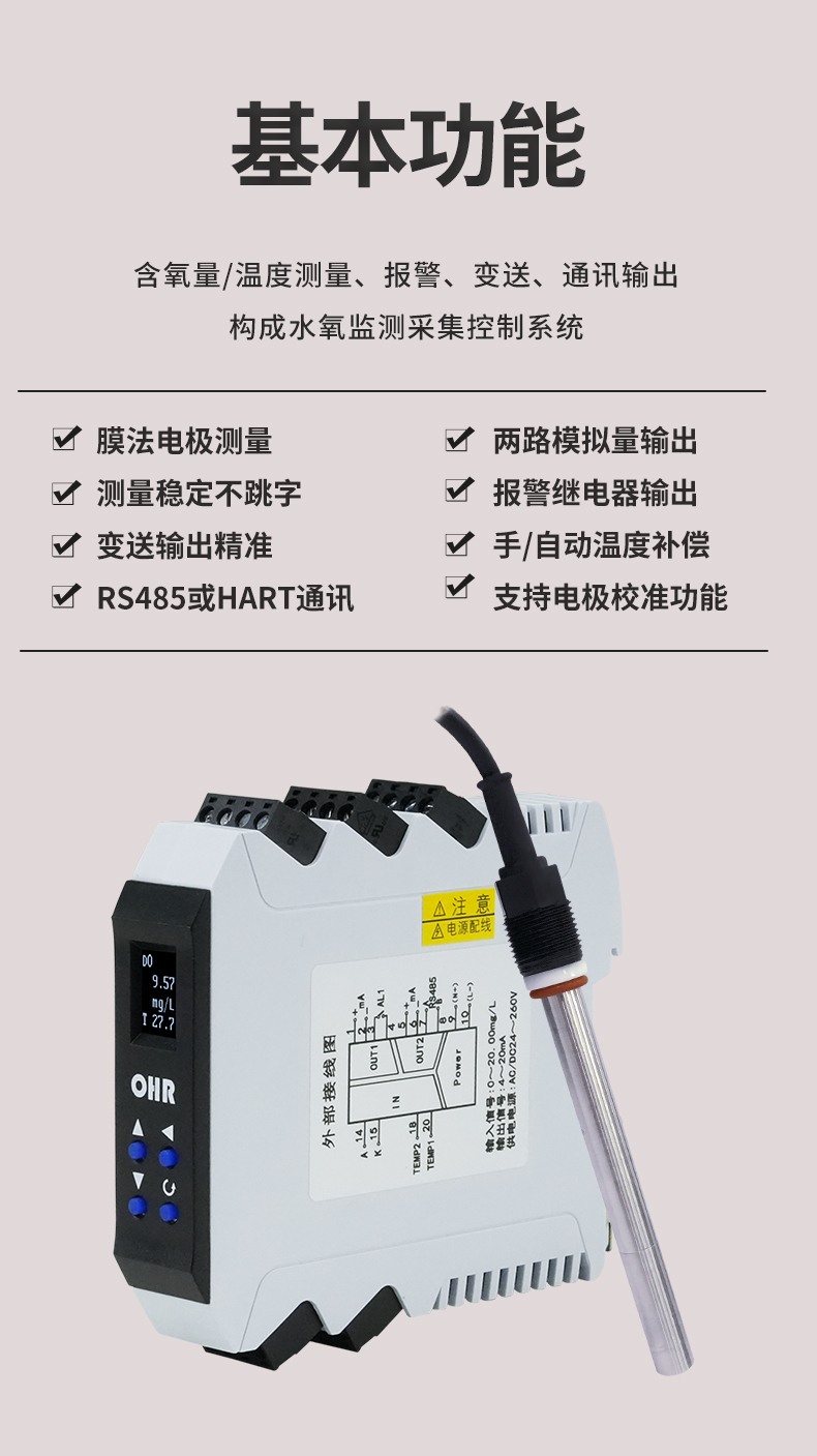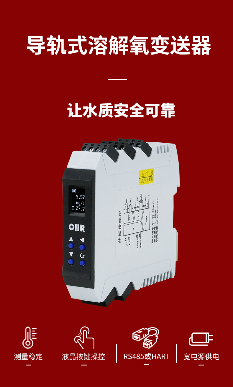 OHR-DO30系列導軌式溶解氧變送器是一款測量水溶液中溶解氧和溫度的變送器,并將測量信號經過隔離傳 送,轉換成所需的信號給其它儀表。具有二路模擬信號輸出,一路繼電器報警輸出,支持RS485通訊或 HART通訊輸出。廣泛應用于火電、化工化肥、冶金、環保、制藥、生化、食品和自來水等溶液中溶解氧和溫度 的連續監測。