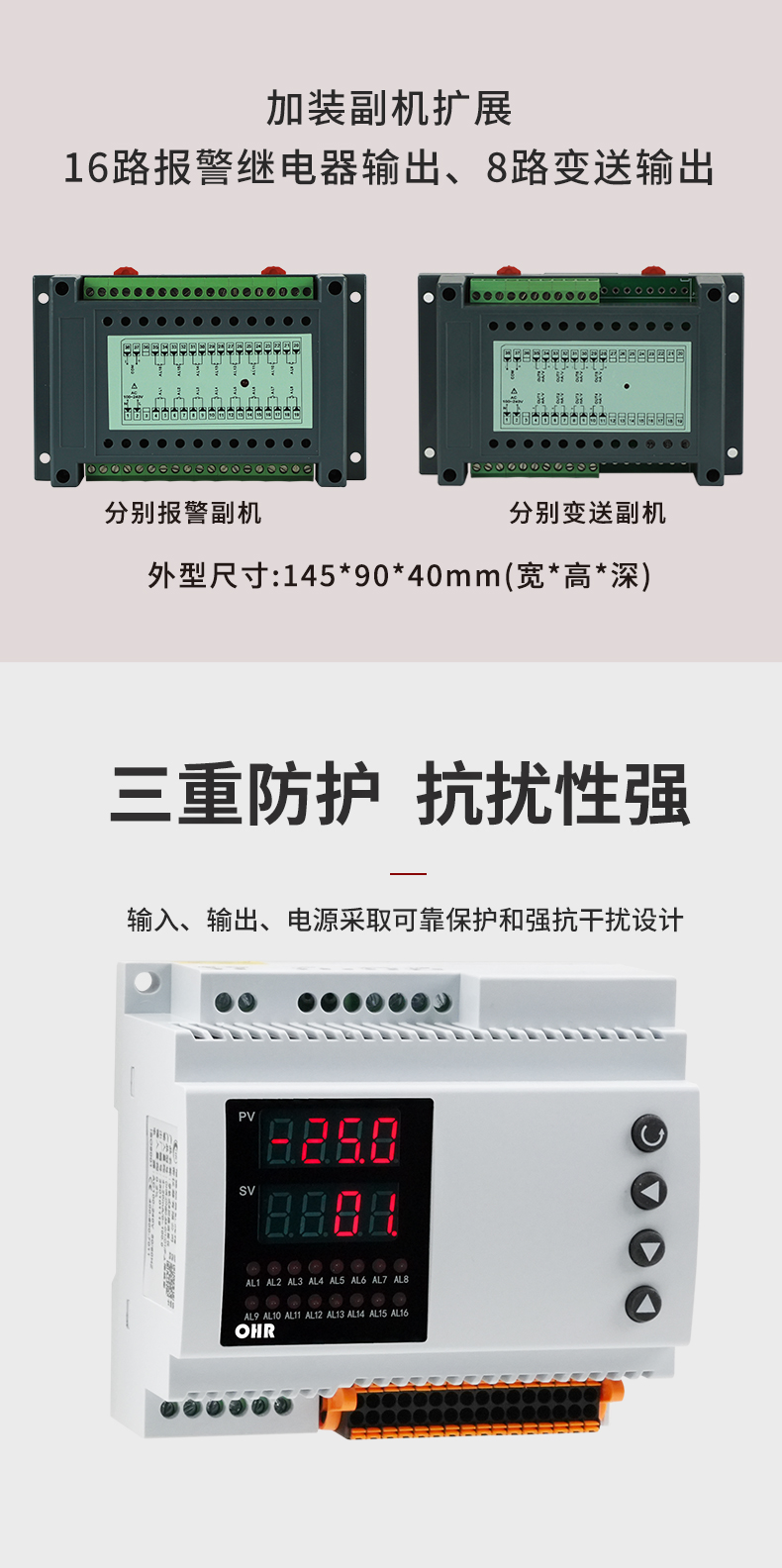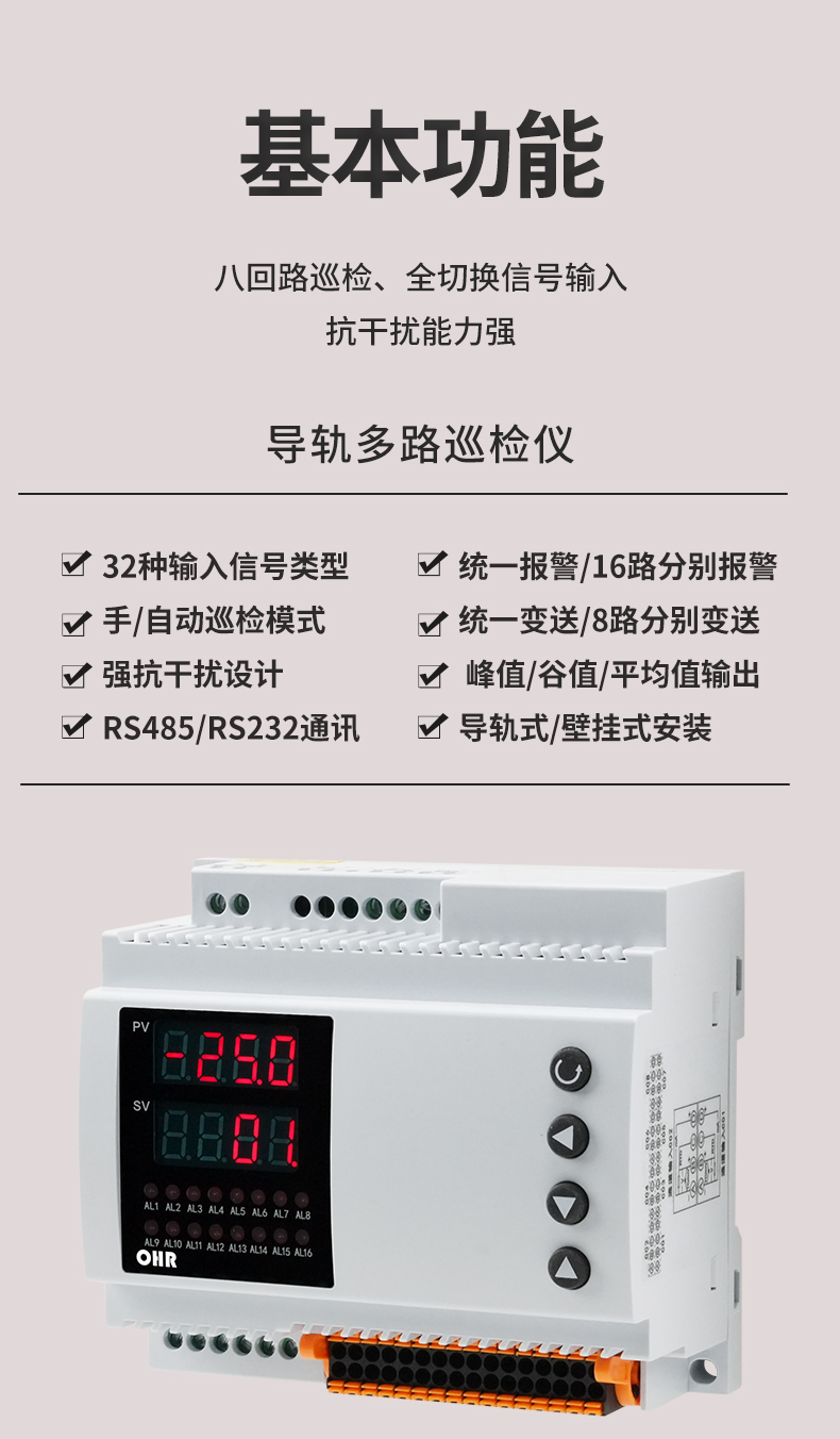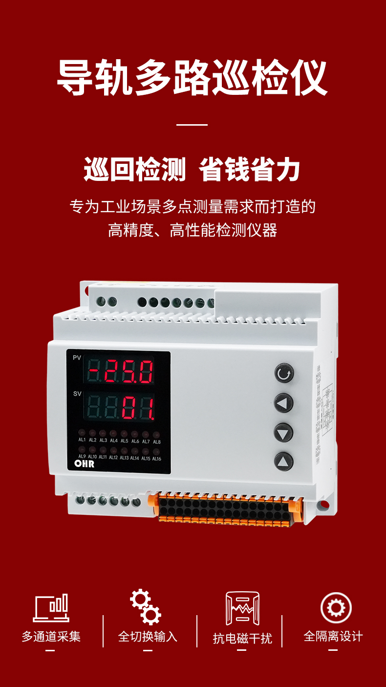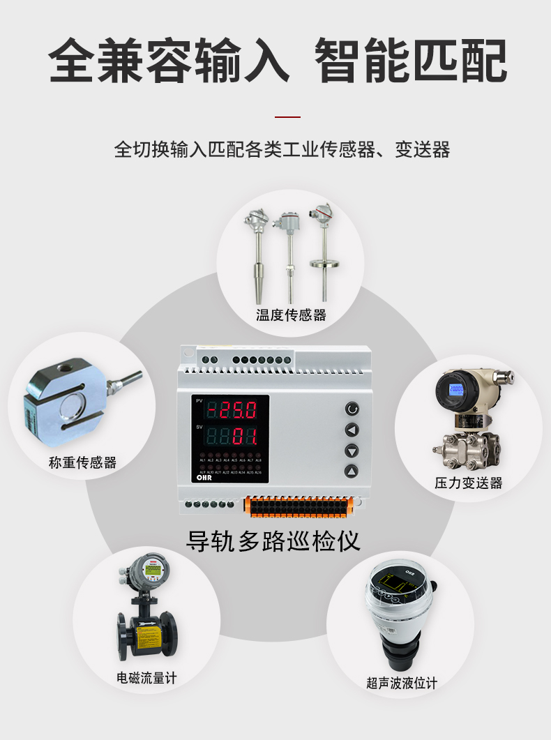 OHR-DN80系列導軌式8回路巡檢儀采用了表面貼裝工藝,全自動貼片機生產,具有很強的抗干擾能力。本儀表 支持多種信號輸入,可與各類傳感器、變送器配套使用,實現(xiàn)對溫度、壓力、液位、速度、力等物理量的測量顯 示,可巡回檢測8路測量信號。