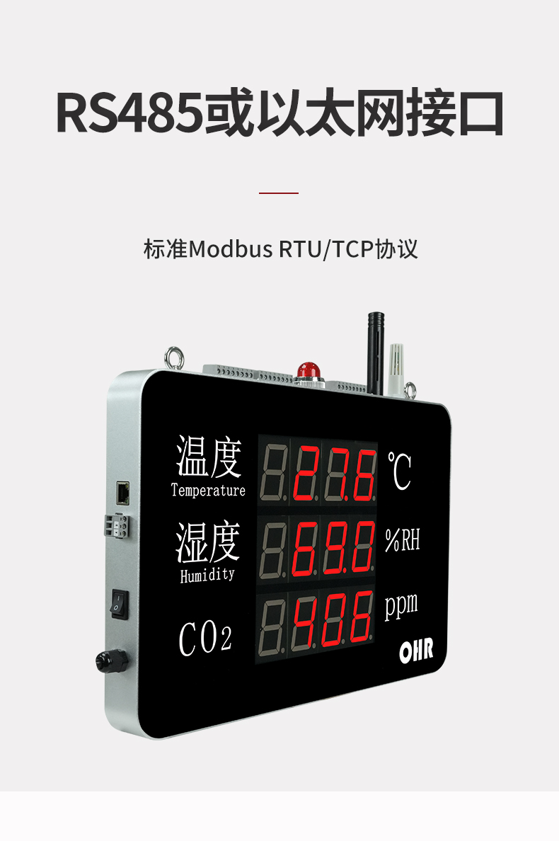 OHR-WS54系列大屏二氧化碳溫濕度記錄儀采用高精度的采集電路及進口傳感器,對環境的二氧化碳、溫濕 度等進行實時監測、報警與記錄。本產品采用鋁合金邊框,高品質亞克力面板,外觀美觀大方;大屏幕 LED數碼管顯示,醒目、便捷,實時顯示二氧化碳值和溫濕度值等信息;可選配RS485、RS232通訊接口或以 太網通訊接口,通過配套的上位機軟件讀取歷史記錄。該產品適用于多種場合,尤其適用于倉庫、車間、 畜牧業中室內環境溫濕度的監測。