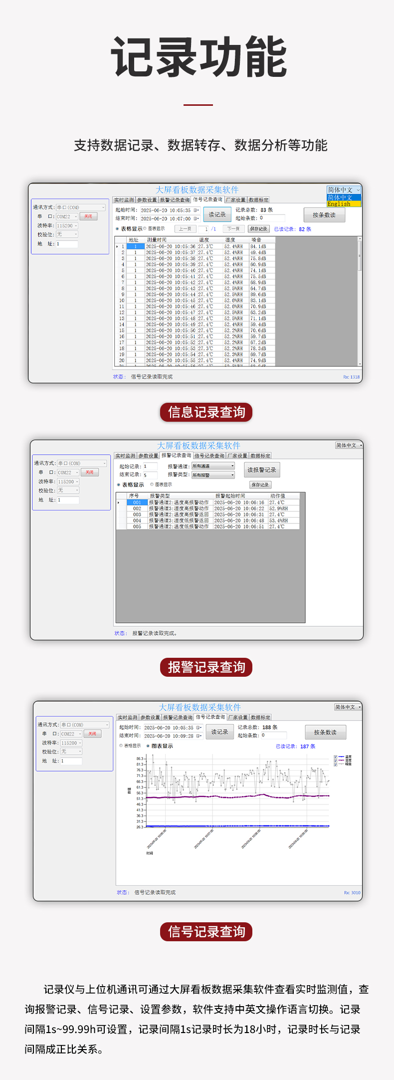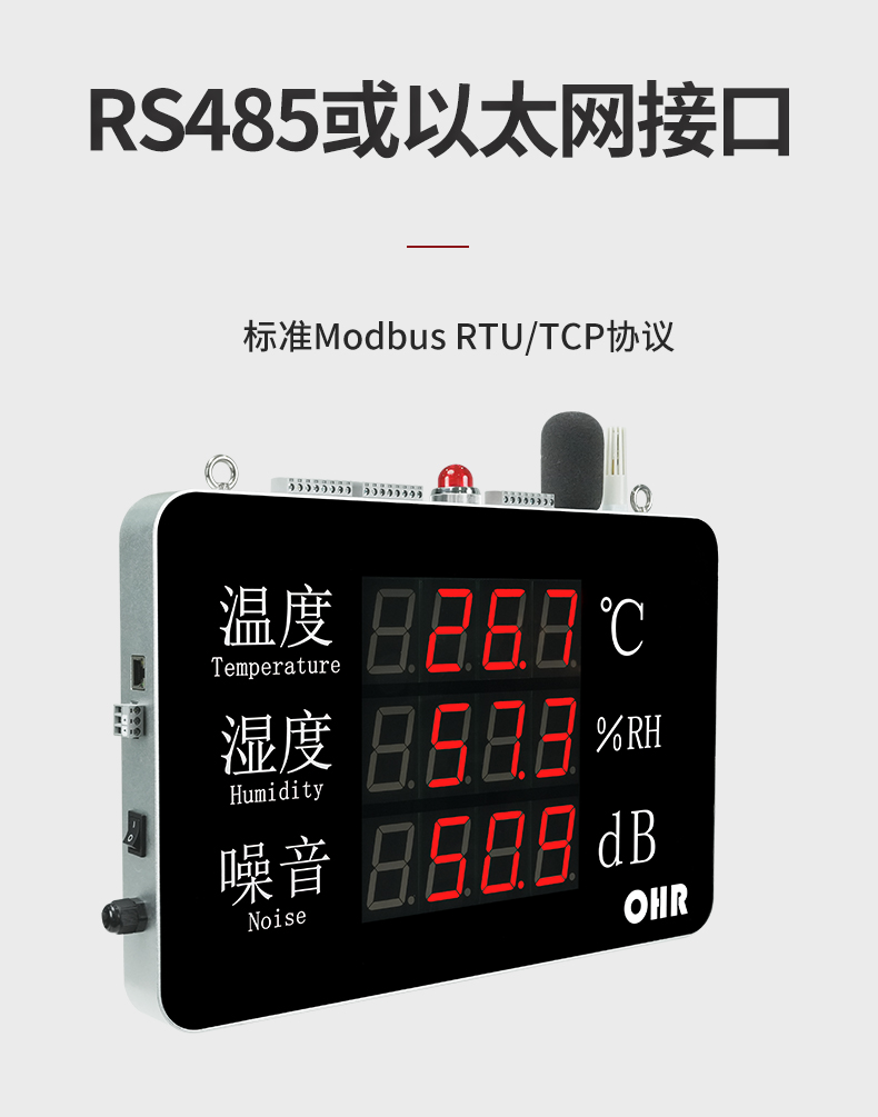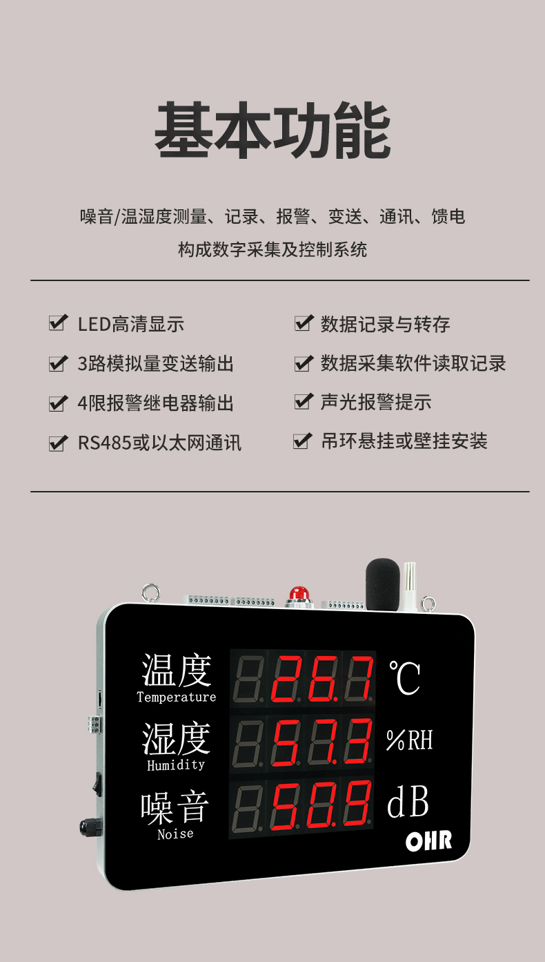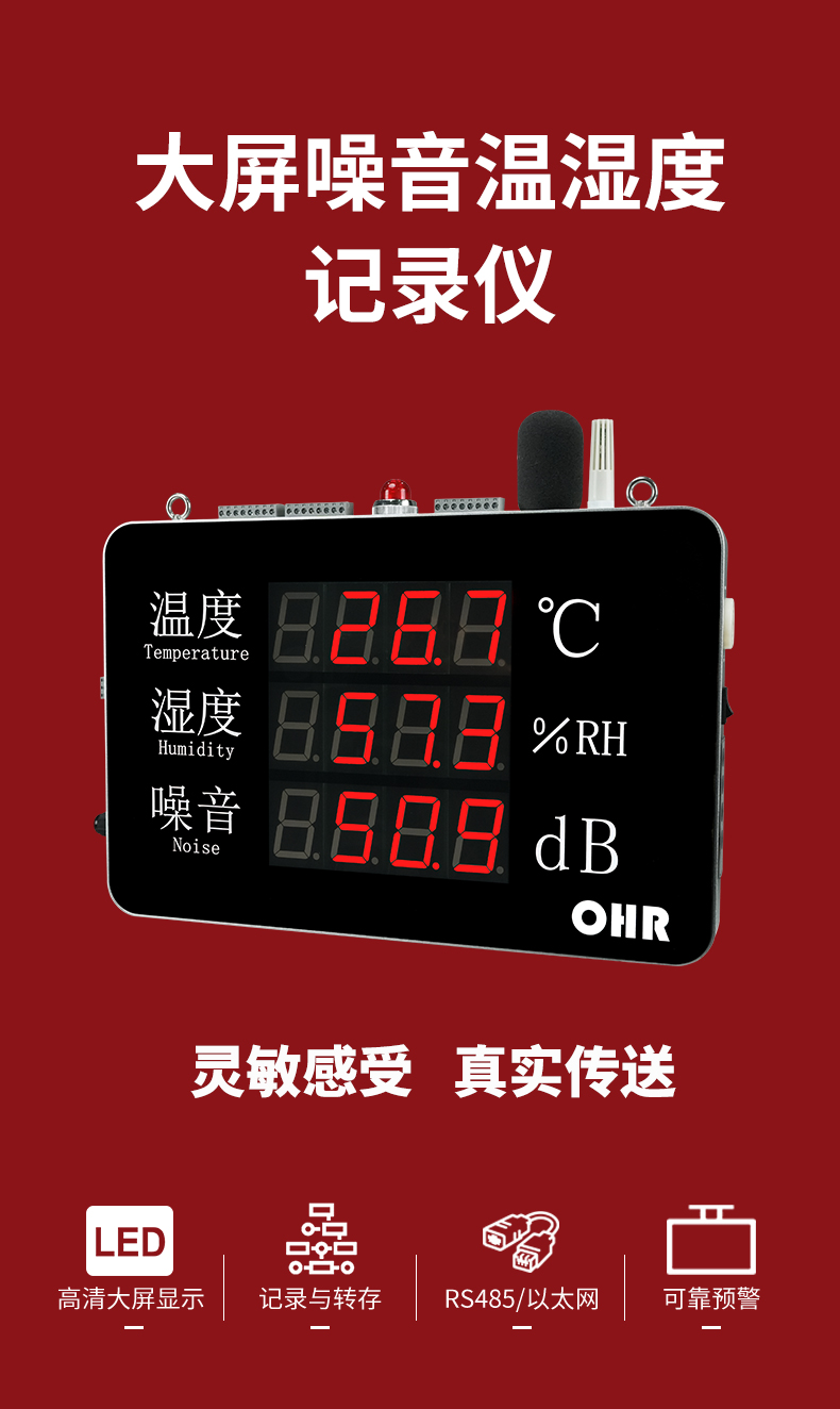 OHR-WS55系列大屏噪音溫濕度記錄儀采用高精度的采集電路及進(jìn)口傳感器,對環(huán)境的噪音、溫濕度等進(jìn) 行實(shí)時(shí)監(jiān)測、報(bào)警與記錄。本產(chǎn)品采用鋁合金邊框,高品質(zhì)亞克力面板,外觀美觀大方;大屏幕LED數(shù)碼 管顯示,醒目、便捷,實(shí)時(shí)顯示噪音值和溫濕度值等信息;可選配RS485、RS232通訊接口或以太網(wǎng)通訊接 口,通過配套的上位機(jī)軟件讀取歷史記錄。該產(chǎn)品適用于多種場合,尤其適用于倉庫、車間、畜牧業(yè)中室 內(nèi)環(huán)境溫濕度的監(jiān)測。